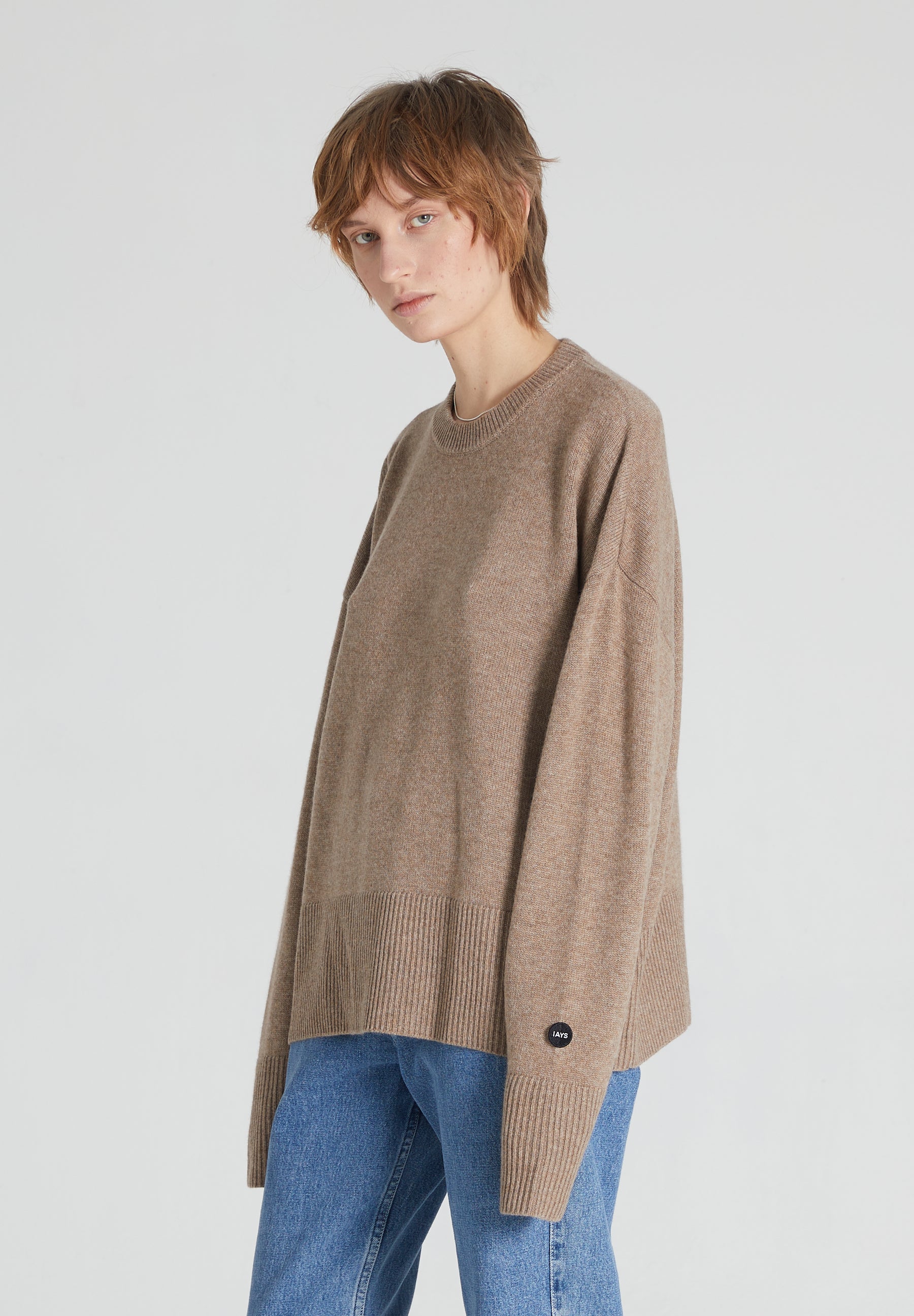 Crew Neck Cinnamon with effortless sophistication, grounded in sustainable craftsmanship and crafted in 100% certified cashmere. Designed with relaxed fit, dropped shoulders, extended sleeves and refined ribbed trims, offering comfort and sophistication. At 7 gg and 2 ply, the knit achieves the perfect balance between softness, durability, and lightness.Model is 174 long and is wearing a size S.DETAILS