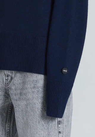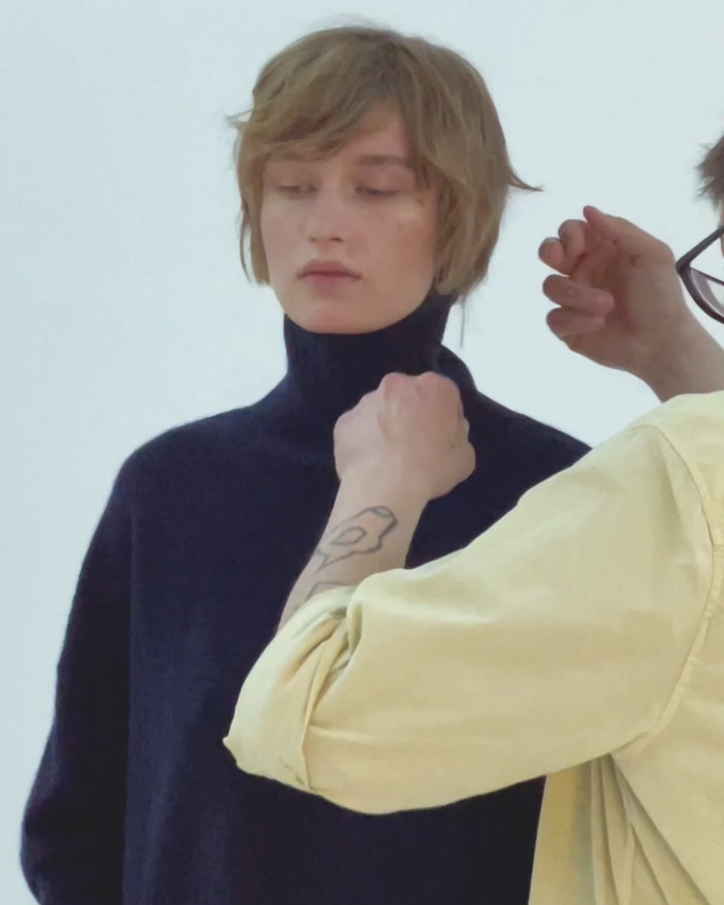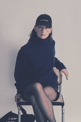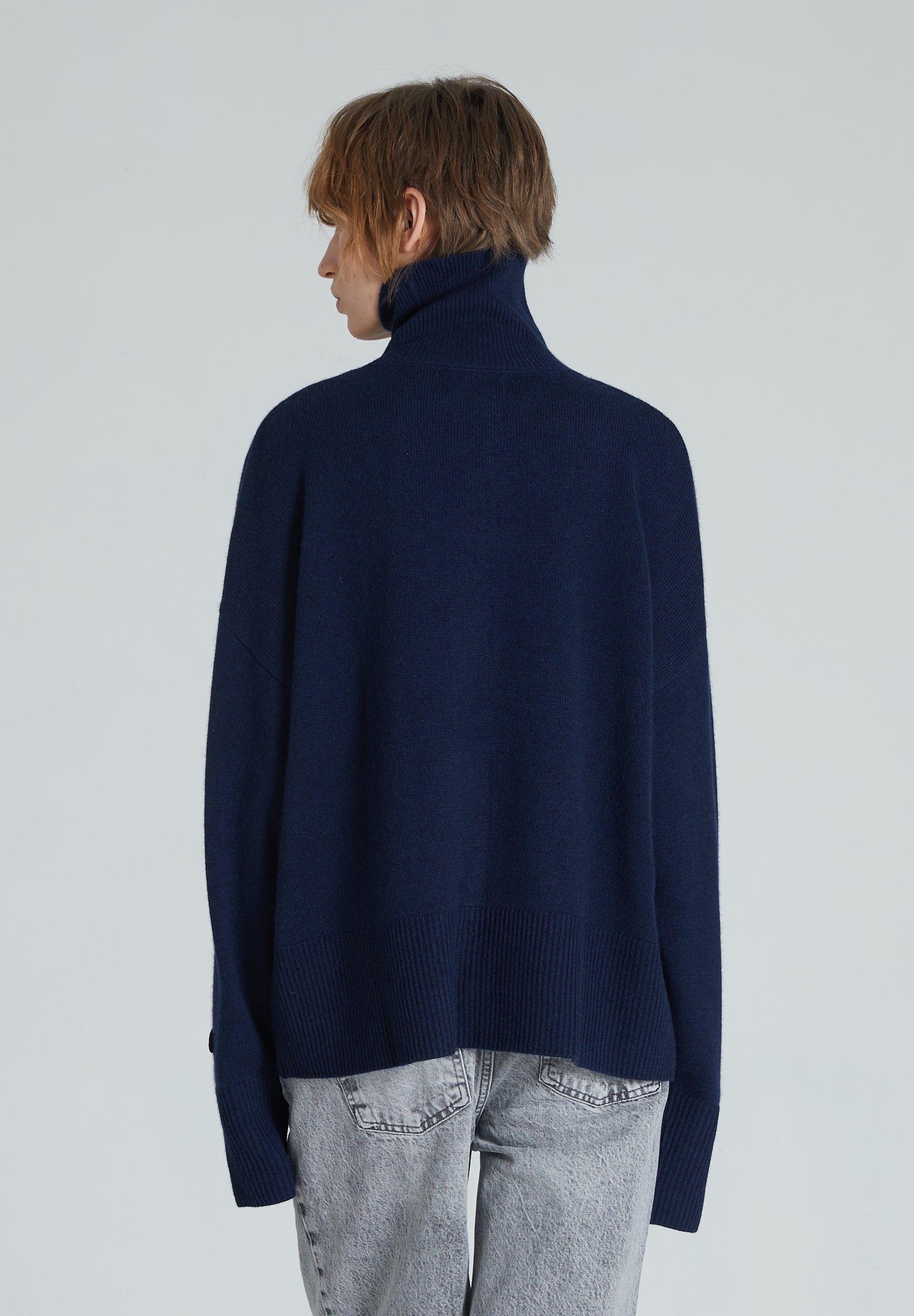 All-season, plain knitted turtleneck with standing neck and ribbed trims. Designed with dropped shoulders, extended sleeves and a relaxed silhouette. Model is 174 long and is wearing a size S.